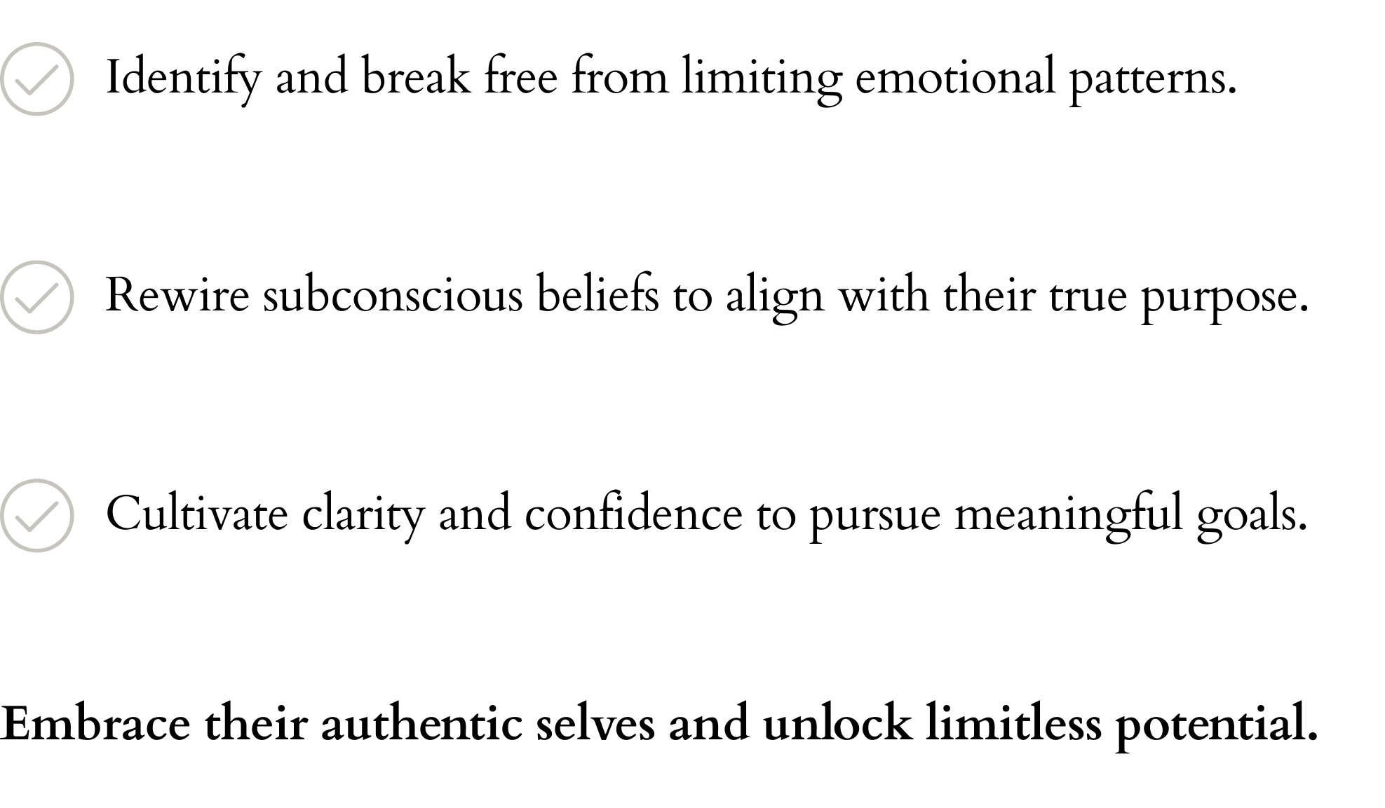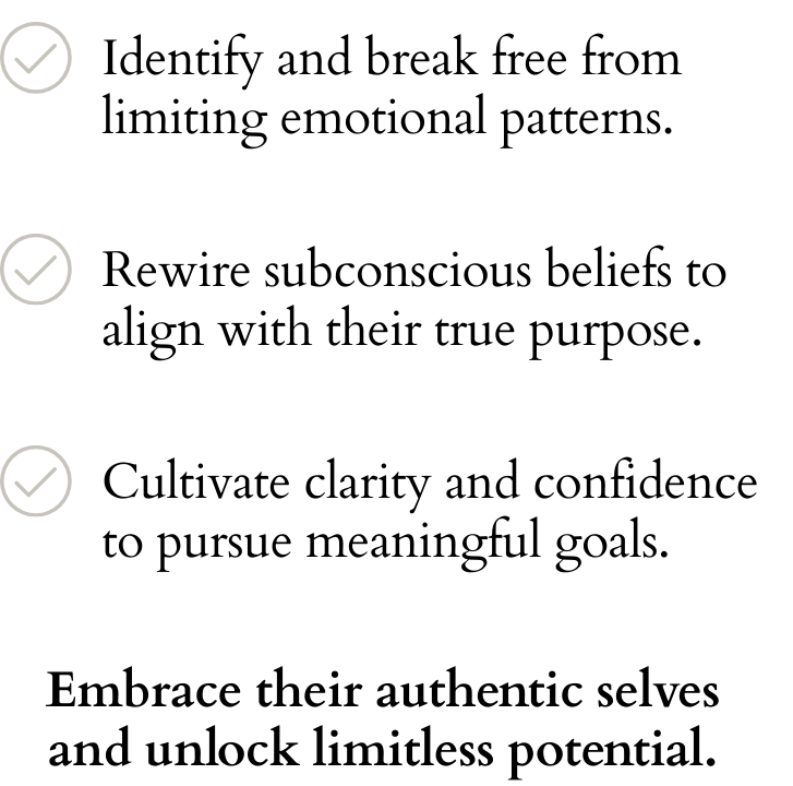Uncover and reframe subconscious patterns to unlock clarity, confidence, and the tools needed for lasting personal transformation.