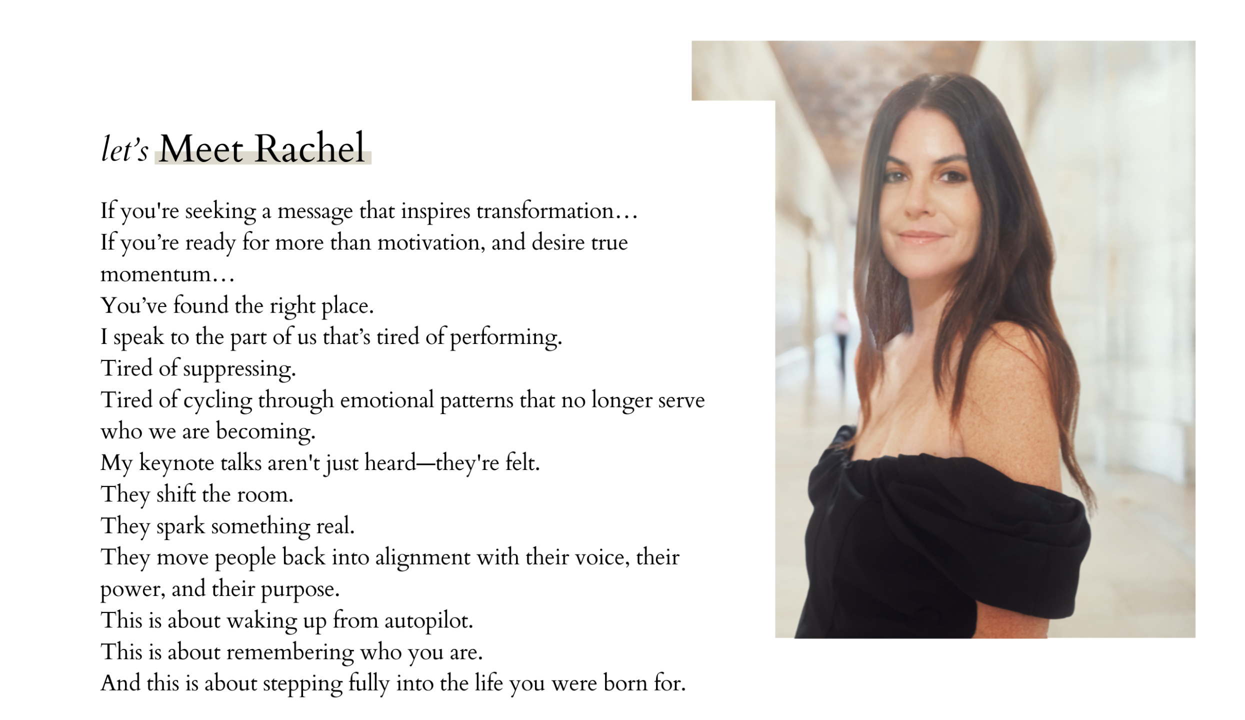 Rachel is a transformative speaker for conferences, workshops, retreats, and corporate events—specializing in topics around self-awareness, emotional clarity, and empowered transformation.